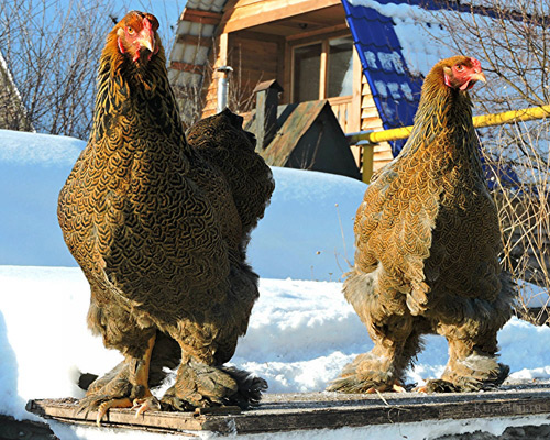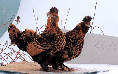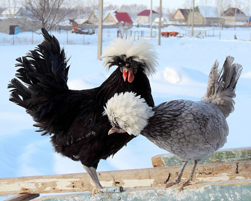 Много веков назад Нижегородская ярмарка представила породу кур по-настоящему эталонной красоты. Местные выводили её более как декоративную, в промышленном масштабе павловская хохлатая работать не может. Это небольшая, лёгонькая птица, своей грацией сильно напоминающая фазана. Петух весит менее двух килограммов, а курочки от силы полтора. Но оперение у них настолько густое и пышное, что визуально добавляет этой малышке величины, а ещё — позволяет выдерживать любые русские морозы. К тому же, двигаться павловские куры перестают лишь во время сна, постоянно активны, весело копошатся, разыскивая корм. Корпус у павловской породы поставлен горизонтально, на голове будто шлем надет: борода, бакенбарды и пышный хохолок создают такое впечатление. Оперение просто волшебное: у одной разновидности на одёжках серебристые пятна, у другой — золотистые.