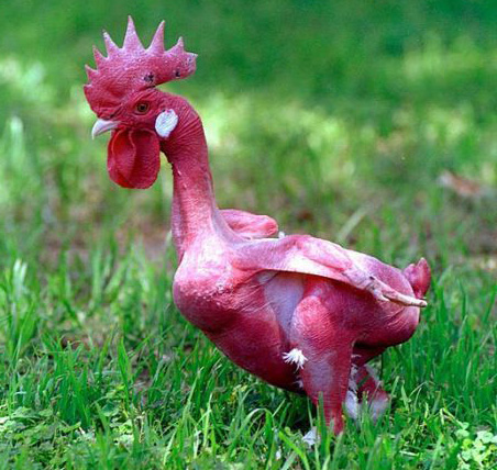Полностью лысые птицы выведены в Израиле. Видимо, из-за постоянной жары или от желания облегчить жизнь домохозяйкам. На первый взгляд впечатление производят почти отталкивающее, так неаппетитны. Но не нужно их жалеть, курочки не больны и созданы без помощи генной инженерии. Просто для разведения выбирались особи с минимальным оперением, и этот эксперимент успешно завершился через долгих двадцать пять лет.